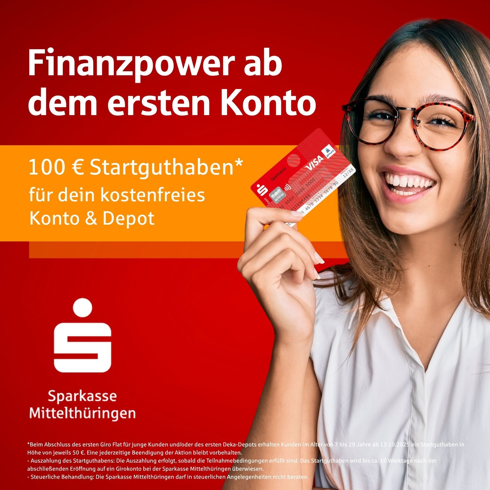 sparkasse mittelthüringenperfekter start für ihr kind: jetzt konto und wertpapier-depot eröffnen und 100 euro startguthaben sichern! das erste eigene konto ist ein wichtiger schritt beim erwachsenwerden. das unterstützen wir natürlich. wenn ihr kind bei uns ein kostenfreies jugendgirokonto eröffnet, geben wir 50 euro startguthaben dazu. und wenn sie gleichzeitig ein depot eröffnen, kommen noch einmal 50 euro obendrauf. so […]01.04.2026 bis 31.05.2026Sparkasse Mittelthüringen